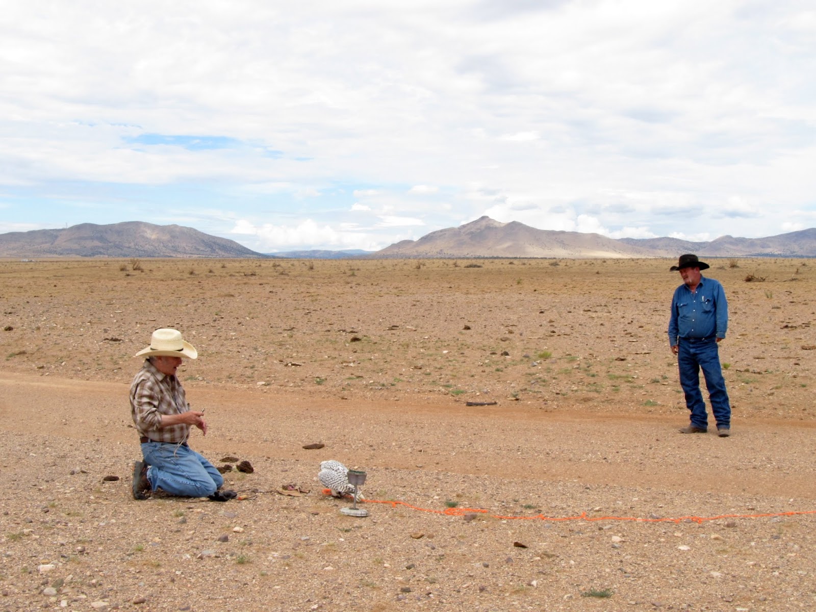 In three days he did something I've never seen in my life, in fifty- eight years of falconry: he trained himself into being a good bird without any vices all by himself. I've now flown him for a week on the creance, and he's ready to fly by himself. No screaming, no mantling; he even takes tidbits delicately from my fingers when he steps off the hare lure. Believe it? I didn't either, but look at the pictures. He also eats his quail meal on the round perch in the kitchen with all the dogs and people around him and doesn't mantle then either.