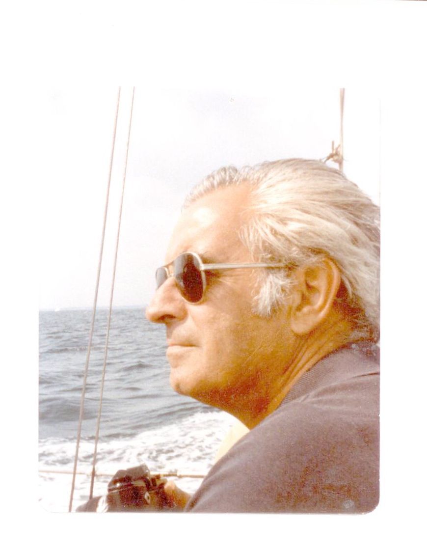 obviously on a sailboat, the wind ruffling his white hair, sunglasses shading